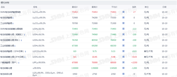 证券之星新能源车行业周报:据上海有色网,截至10月10日,电池级碳酸锂7.29-7.42万元/吨,均价7.355万元/吨,与上一工作日持平;工业级碳酸锂7.07-7.19万元/吨,均价7.13万元/吨,与上一工作日持平。 碳酸锂期货价格延续震荡走势,主力合约处在7.26-7.53万元/吨之间震荡。节后首周市场成交清淡,上下游均持观望态度。