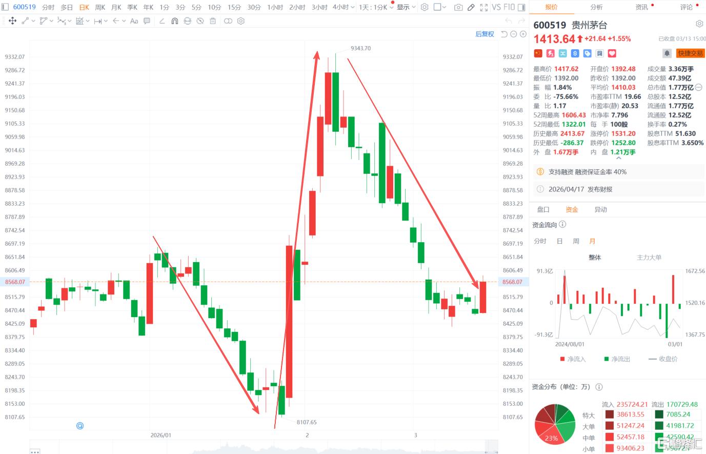 截至今日收盘,茅台收涨1.55%报1413.64元,总市值1.77万亿元。