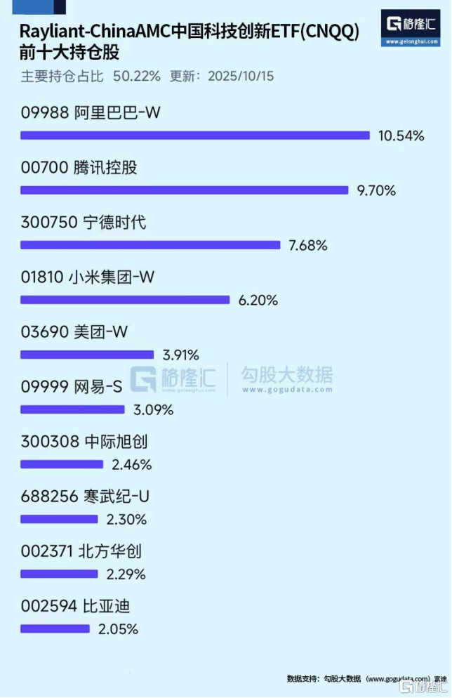 如CNQQ的重仓股,有AI云计算和应用大厂阿里巴巴、腾讯控股、小米、美团、网易,也有全球领先的新能源和半导体制造企业宁德时代、比亚迪、中际旭创、寒武纪、北方华创。