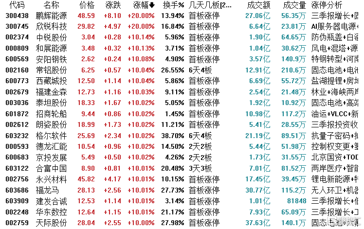焦点股方面,时空科技晋级7连板,机器人概念股亚士创能5连板,常铝股份与格尔软件均走出6天4板,瑞尔特、德龙汇能等3连板,方正电机3天2板,神州信息、振华股份等2连板。