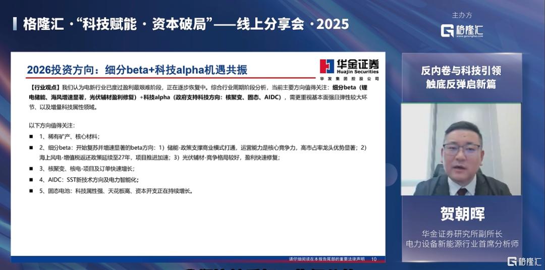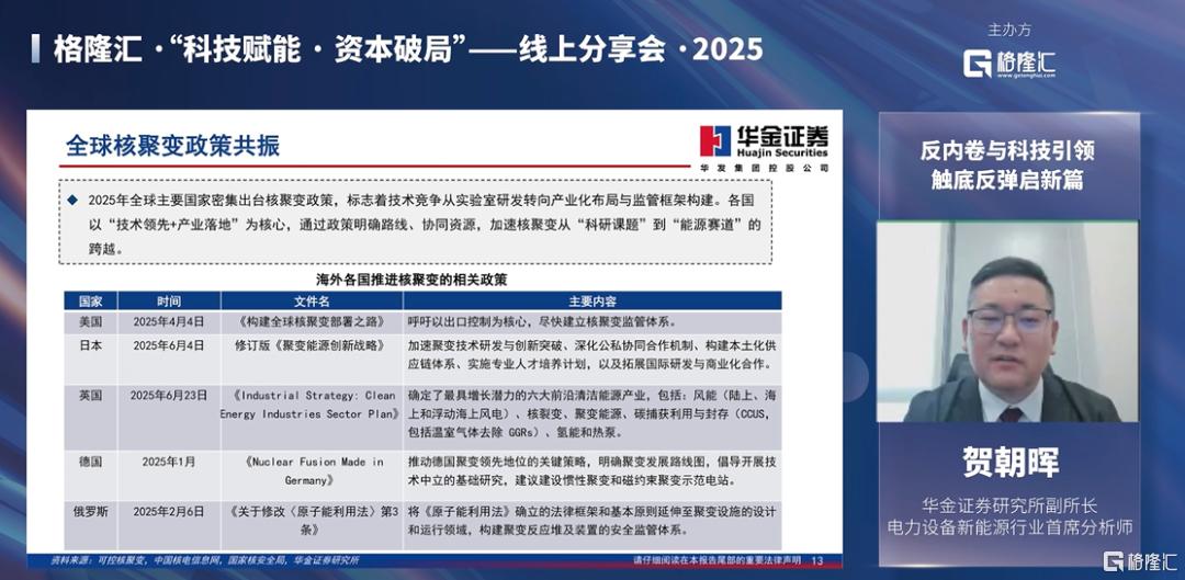 近日,在格隆汇举办的“科技赋能·资本破局”分享会上,华金证券研究所副所长、电力设备新能源行业首席分析师贺朝晖围绕“反内卷与科技”双轮驱动,聚焦“核聚变、AIDC供电架构、固态电池”三大科技领域展开分析。