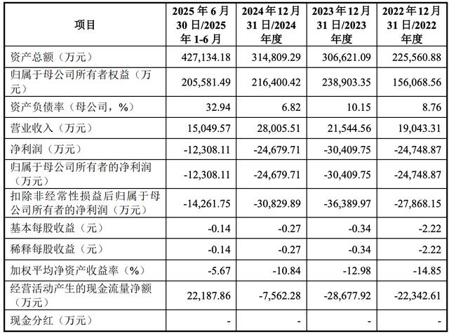 2022年、2023年和2024年度和2025年上半年,视涯科技的营收分别约为1.90亿元、2.15亿元、2.80亿元和1.50亿元,净利润分别约-2.47亿元、-3.04亿元、-2.47亿元和-1.23亿元,扣非后净利润分别约-2.79亿元、-3.64亿元、-3.08亿元和-1.43亿元。