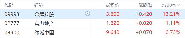 港股金辉控股涨超13%,富力地产涨超1%,此前一度涨超10%。