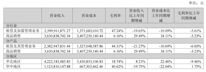 但业务结构的此消彼长却带来了盈利质量的下降。财报显示,商品销售业务的平均毛利率仅为6.16%,低于租赁和加盟管理业务47.24%的毛利率水平。
