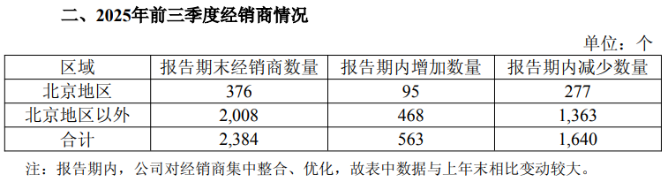 这一系列业务调整直接反映在渠道网络的整合上。2025年前三季度,公司经销商总数净减少明显,期末数量为2384家。其中,北京地区减少277家,北京以外地区大幅减少1363家,合计减少1640家,而同期新增经销商仅563家。净减少的经销商数量约为新增数量的3倍。