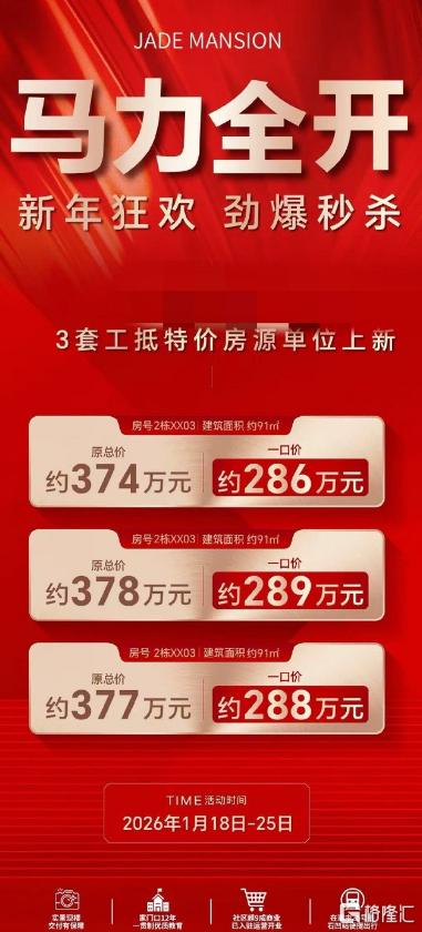 最近,位于深圳龙华的一个项目,甩出一张海报——马力全开,新年狂欢,劲爆秒杀,3套工抵房上新,91平原价约374万一口价约286万,原价约378万一口价约289万,原价约377万一口价约288万。