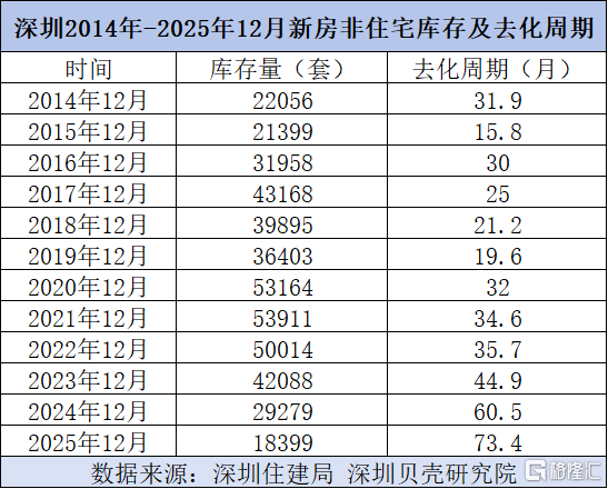 而根据深圳贝壳研究院及深圳房地产信息平台数据,深圳2025年12月的非住宅类新房库存量为18399套,去化周期约为73.4个月,而2021年12月深圳的非住宅类新房库存量为53911套,去化周期为34.6个月。