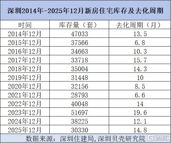 根据深圳贝壳研究院及深圳房地产信息平台数据,深圳2025年12月的新房住宅库存量为30330套,去化周期约为14.8个月,而2021年12月深圳的新房住宅库存为28793套,去化周期为6.6个月。