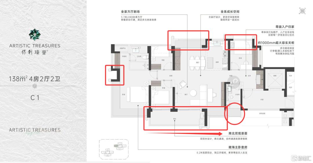 而深圳保利瑧誉项目约138平户型,虽然也是五开间,但5开间中被一个厕所占了一个位置,不仅每个空间都设计了飘窗,卧室、客厅也与阳台错位,无法做到开间对齐,阳台开间比卧室+客厅开间,少了一个飘窗的尺寸。