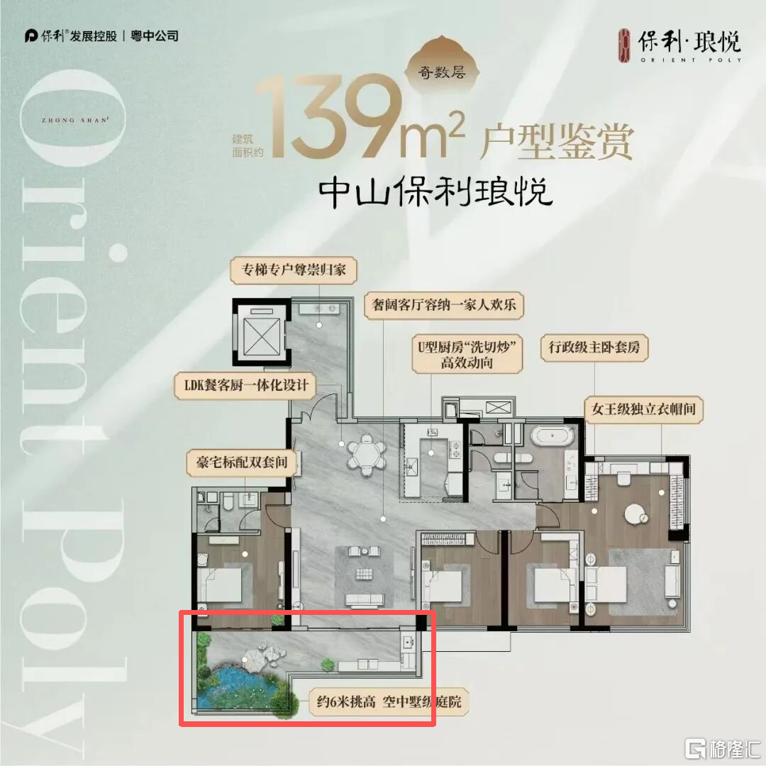 约139平的户型,中山保利琅悦项目的格局上,做到正常的五开间,并且户型内部不会设计过多的飘窗占用卧室空间,阳台、套间卧室以及客厅不会出现错位,阳台约5.1米的开间,套间卧室+客厅的开间也对齐是约5.1米,户型的使用率也卷到了约130%。