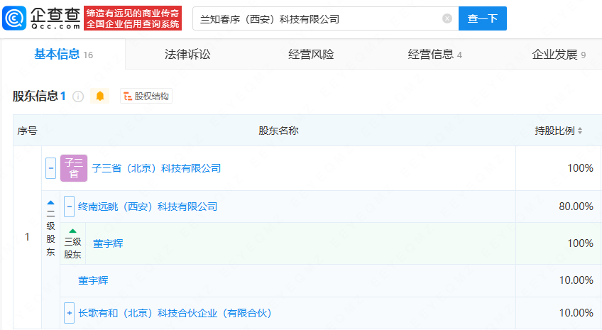 企查查显示,该公司成立于2024年12月,法定代表人为董宇辉,注册资本500万人民币,由子三省(北京)科技有限公司全资持股,董宇辉为实际控制人。据报道,不久前,“与辉同行”开通新账号“兰知春序”,值此中国电影120周年之际,特别推出《主创请开麦》节目。