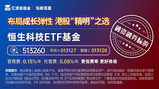 风险提示:基金有风险,投资需谨慎。投资人应当阅读《基金合同》《招募说明书》《产品资料概要》等法律文件,了解基金的风险收益特征,特别是特有风险,并根据自身投资目的、投资经验、资产状况等判断是否和自身风险承受能力相适应。基金管理人承诺以诚实信用、谨慎尽责的原则管理和运用基金资产,但不保证基金一定盈利或本金不受损失。恒生科技ETF基金属于中等风险等级(R3)产品,适合经客户风险等级测评后结果为平衡型(C3)及以上的投资者。标的指数并不能完全代表整个股票市场。标的指数成份股的平均回报率与整个股票市场的平均回报率可能存在偏离。请投资者关注指数化投资的风险以及集中投资于单一指数成分股的持有风险,请关注部分指数成分股权重较大、集中度较高的风险,请关注指数化投资的风险、ETF运作风险、投资特定品种的特有风险等;以上产品投资于境外证券市场,基金净值会因为所投资证券市场波动等因素产生波动。