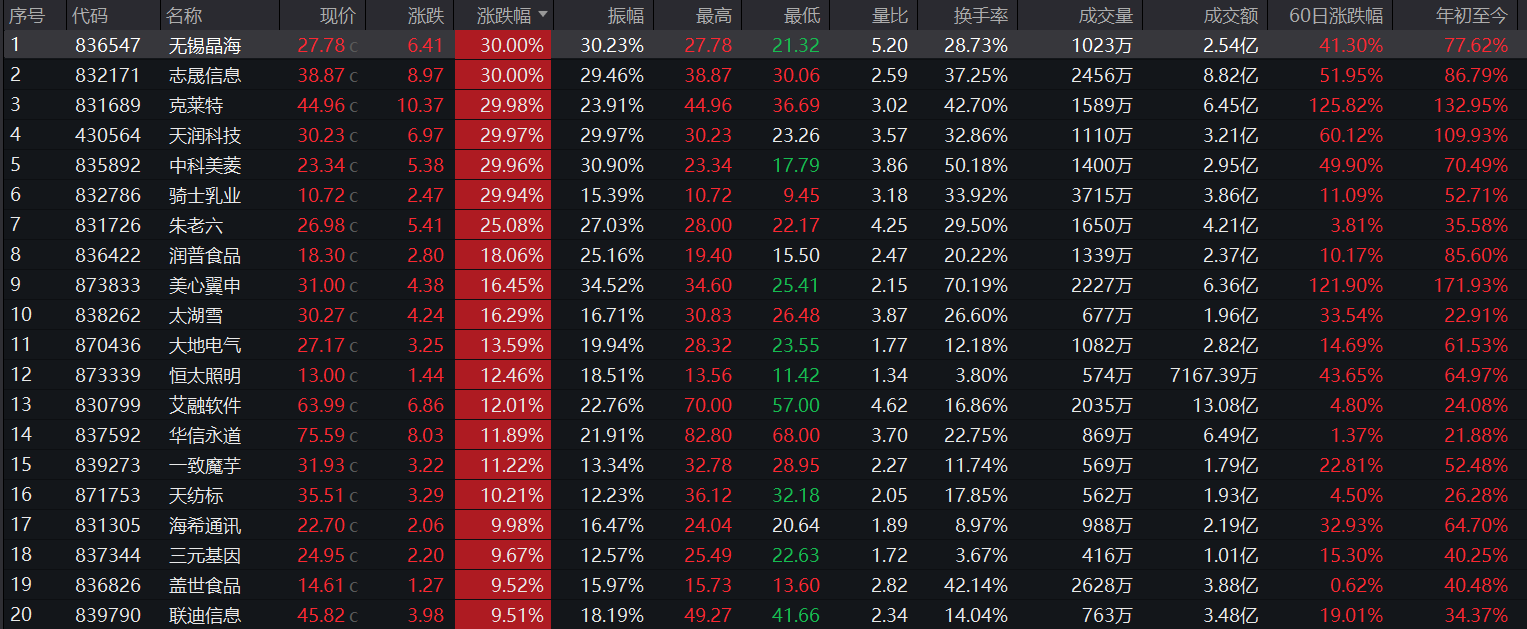 涨幅方面,无锡晶海(836547)、志晟信息(832171)、克莱特(831689)、天润科技(430564)、中科美菱(835892)和骑士乳业(832786)6只个股涨停!
