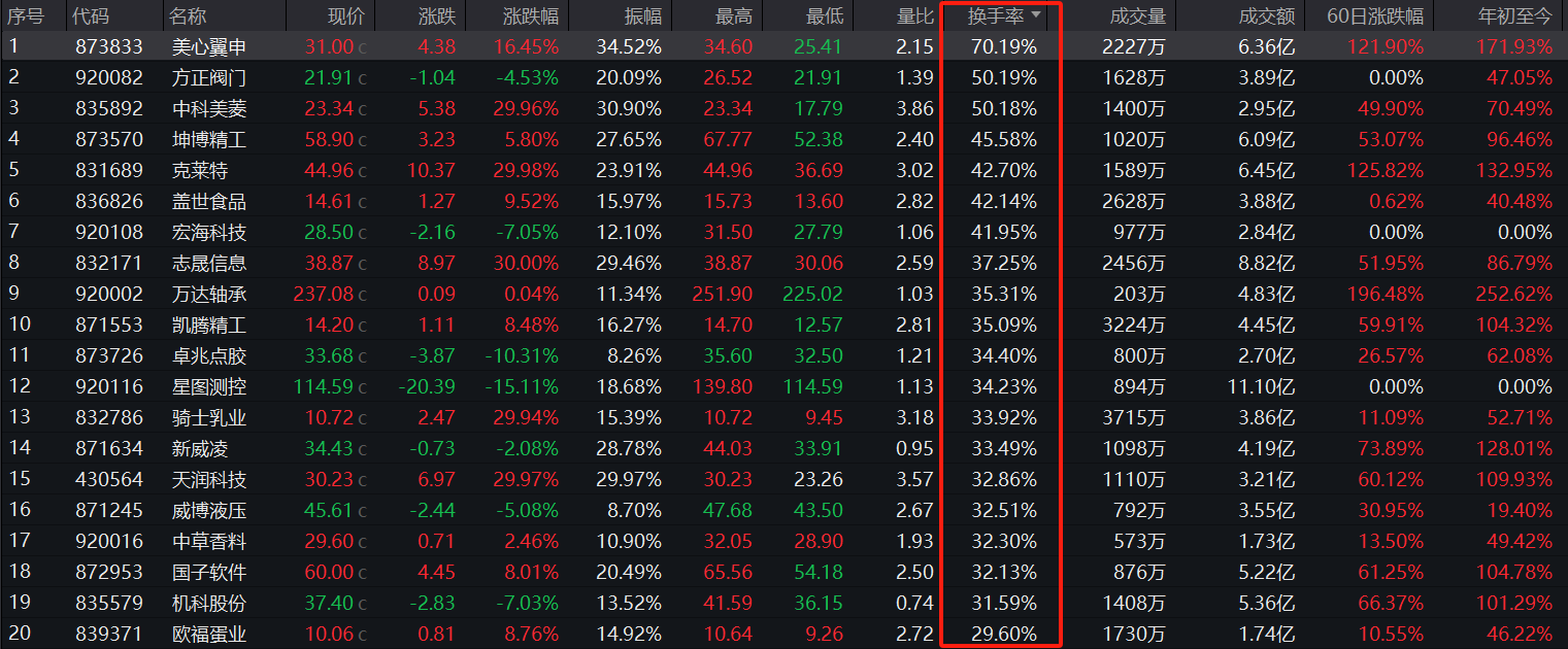 换手率方面,美心翼申(873833)以70.19%的换手率高居榜首;方正阀门(920082)换手率为50.19%,位列第二;中科美菱(835892)和坤博精工(873570)分别以50.18%和45.58%的换手率位列第三和第四;克莱特(831689)换手率为42.70%,位居第五。