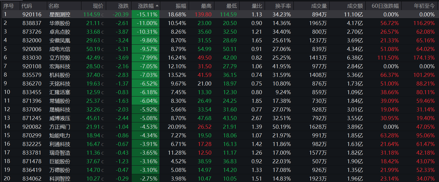 跌幅榜方面,星图测控(920116)以15.11%的跌幅居首,华原股份(838837)和卓兆点胶(873726)分别下跌11.00%和10.31%。安徽凤凰(832000)和成电光信(920008)跌幅分别为9.86%和9.57%。