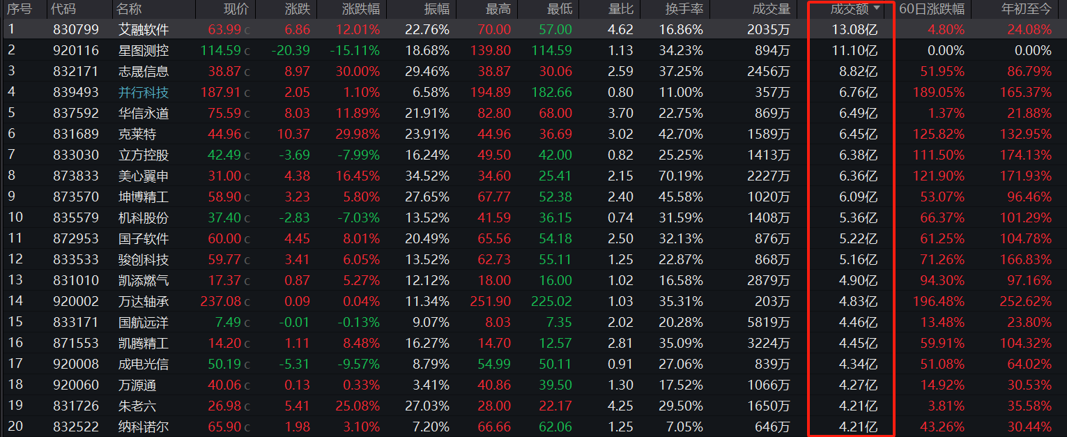 成交额方面,艾融软件(830799)以13.08亿元的成交额位居榜首;星图测控(920116)成交11.10亿元,位列第二;志晟信息(832171)和并行科技(839493)分别成交8.82亿元和6.76亿元,位列第三和第四;华信永道(837592)成交6.49亿元,位居第五。