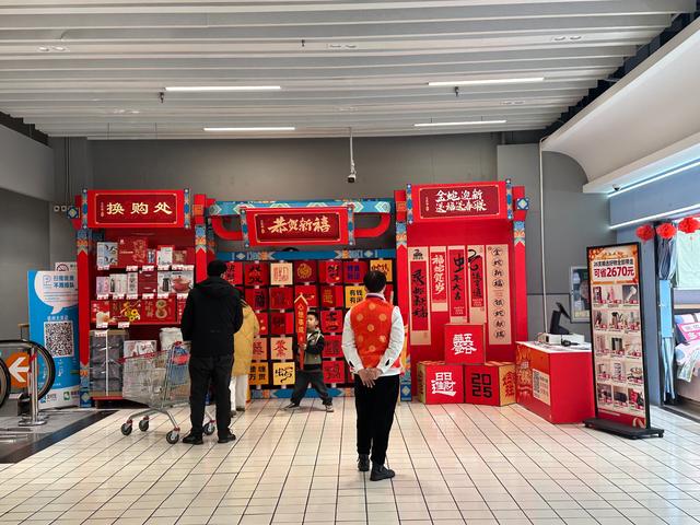 在李茗蕊离开超市的时候,看到一个小朋友站在氛围墙前,手持“心想事成”的上上签,小朋友的父亲推着一车年货与他对话,母亲则在旁边用手机记录下这一刻,不远处,还有一位身着红色小马甲的员工看着他们,背景里的刘德华正好唱到“祝大家笑口常开”——这正是她记忆中过年的模样。