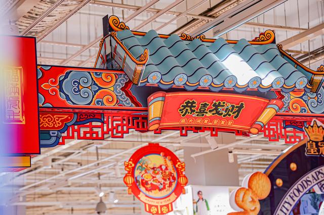 李茗蕊告诉壹览商业,当她踏入大润发,就看到一个明清建筑风格的红色大门,主通道被布置成街道的模样,一眼望不到头;抬眼一看,天花板挂着红彤彤的中国结、对联和灯笼;耳边回荡着“我恭喜你发财……”这首“贺岁神曲”的旋律,满目的红和喜气一下子点燃了她十来岁时与父母逛超市、置办年货的记忆。