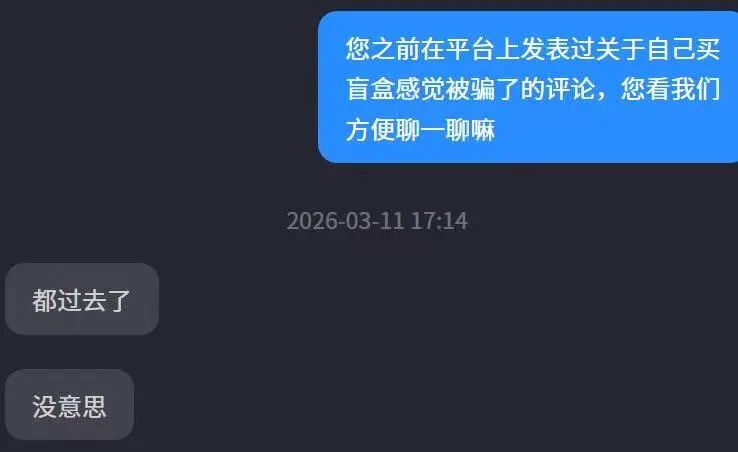 日前,记者还联系到一位在网上声称自己被盲盒消费“骗了小一万”的消费者。她在社交媒体一条有关盲盒骗局的短视频下评论:“已经被骗了有小一万了,家里一堆萌粒还有电器化妆品,已经是一个冤种了。”然而,面对记者私信采访邀约,她却婉拒称:“都过去了,没意思。”