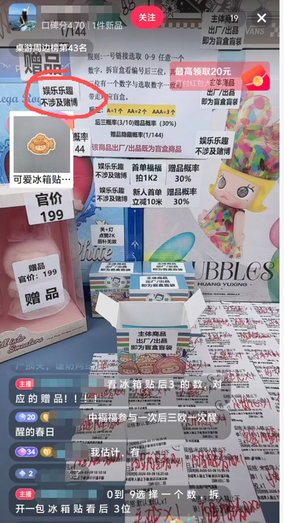 虽然目前在不少盲盒直播间中也会挂出“不涉及赌博”的标识,但廖建勋律师认为,其核心设计并非正常的商品销售,而是利用随机配对、连环触发、连续刺激的机制,是一种贴近博彩的玩法。即便商家反复标注“非赌博”,也无法掩盖其“射幸”属性强、成瘾性高。