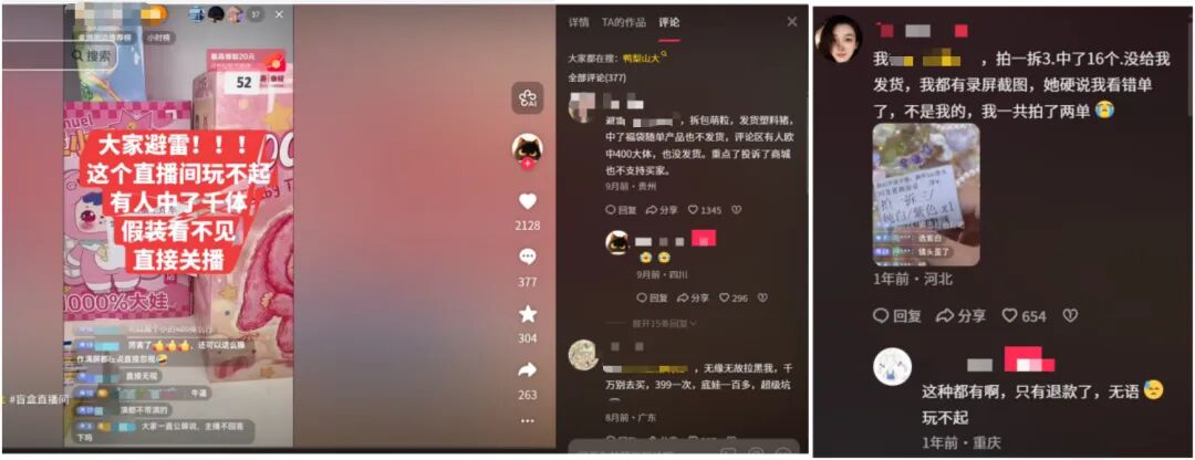 由于目前盲盒直播的合规界限还不够清晰,相关消费者也不易识别相关骗局,即使意识到受骗也认为难以维权。这也是盲盒直播得以在法律法规边缘游走的重要原因。