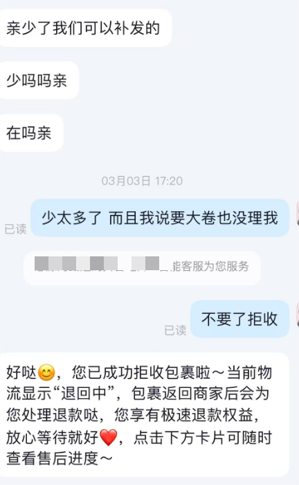 另外,一位在某直播间消费3000元以上的消费者黄丽告诉《消费者报道》记者,她购买的大部分盲盒产品都没有标生产厂家,“前两天刚对对碰的垃圾袋本来应有320个,商家只发90个,我就退货退款了。”黄丽说。