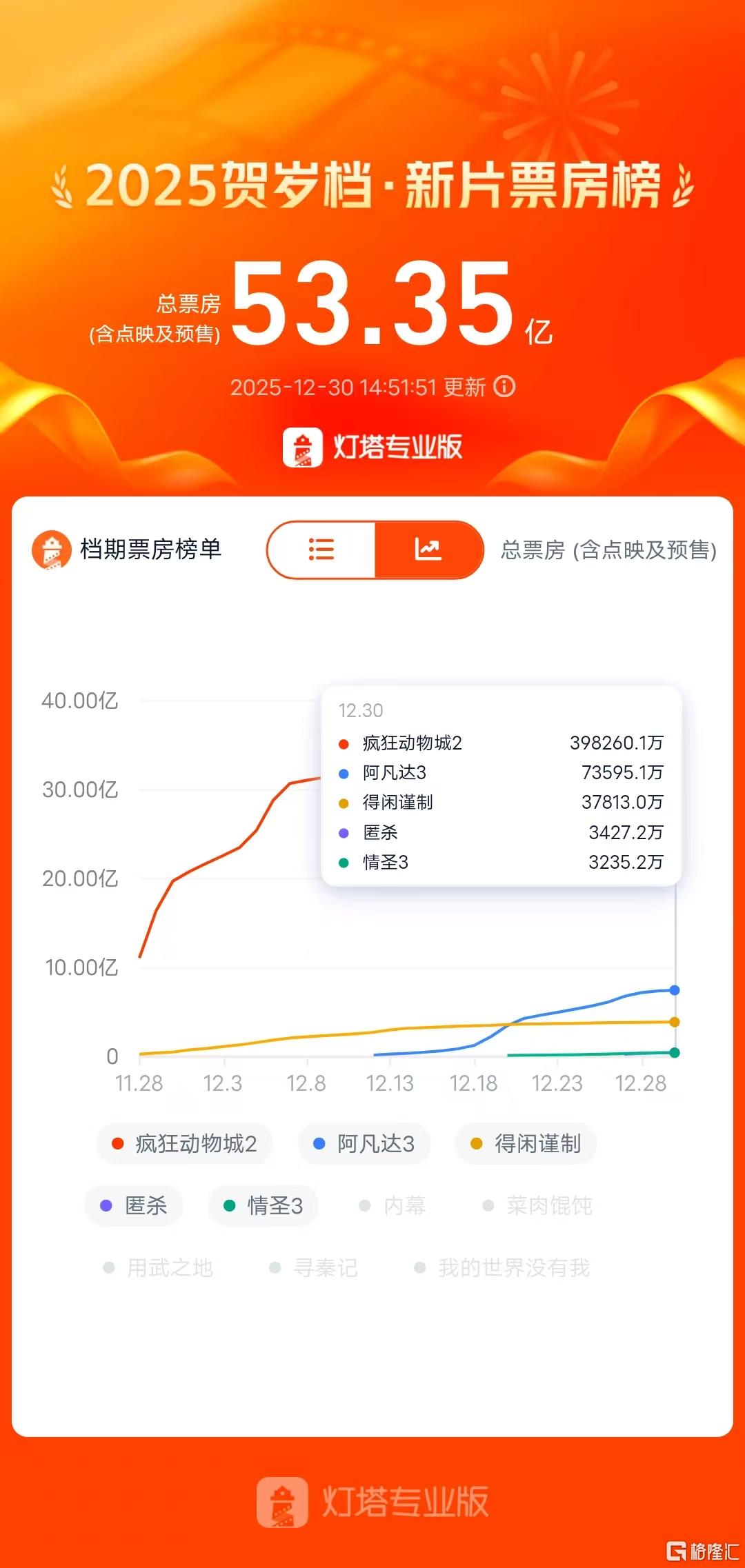 截至12月30日下午,灯塔专业版数据显示,2025贺岁档(11月28日至12月31日)票房已突破53亿元,创下近8年来的新高,仅次于2017年的55.99亿元。