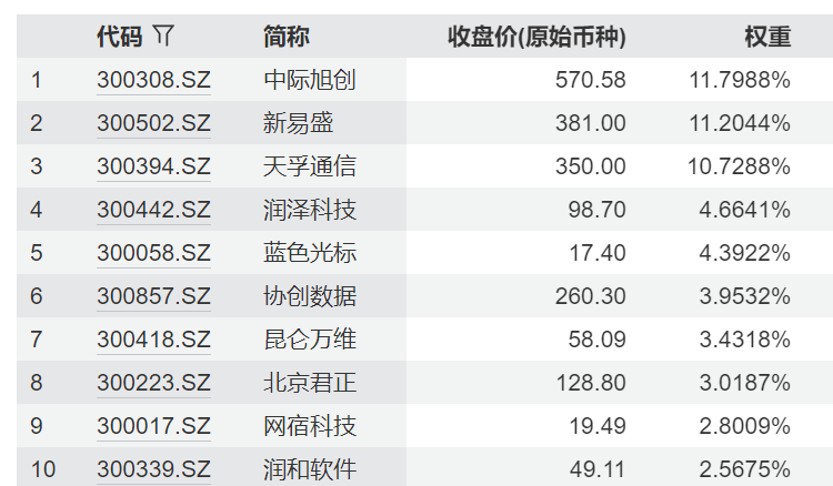 最值得关注的是它在AI硬件端的配置。指数前三大成份股均为光模块龙头:中际旭创权重11.8%、新易盛11.2%、天孚通信10.73%。在算力需求爆发的当下,光模块是业绩兑现最清晰、订单能见度最高的环节之一。