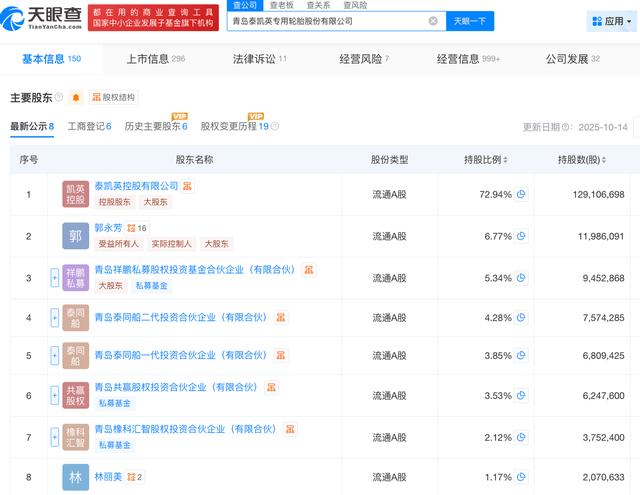 天眼查App信息显示,泰凯英成立于2017年10月,前称为青岛泰凯英轮胎有限公司。目前,该公司的注册资本为1.77亿元,法定代表人为王传铸,主要股东包括泰凯英控股有限公司、郭永芳等。