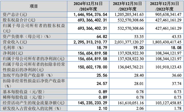 业绩方面,2022年、2023年和2024年,泰凯英的收入分别为18.03亿元、20.31亿元和22.95亿元,复合增长率约为12.82%;净利润分别约为1.08亿元、1.38亿元和1.57亿元,扣非后净利润分别约为1.02亿元、1.36亿元和1.51亿元。