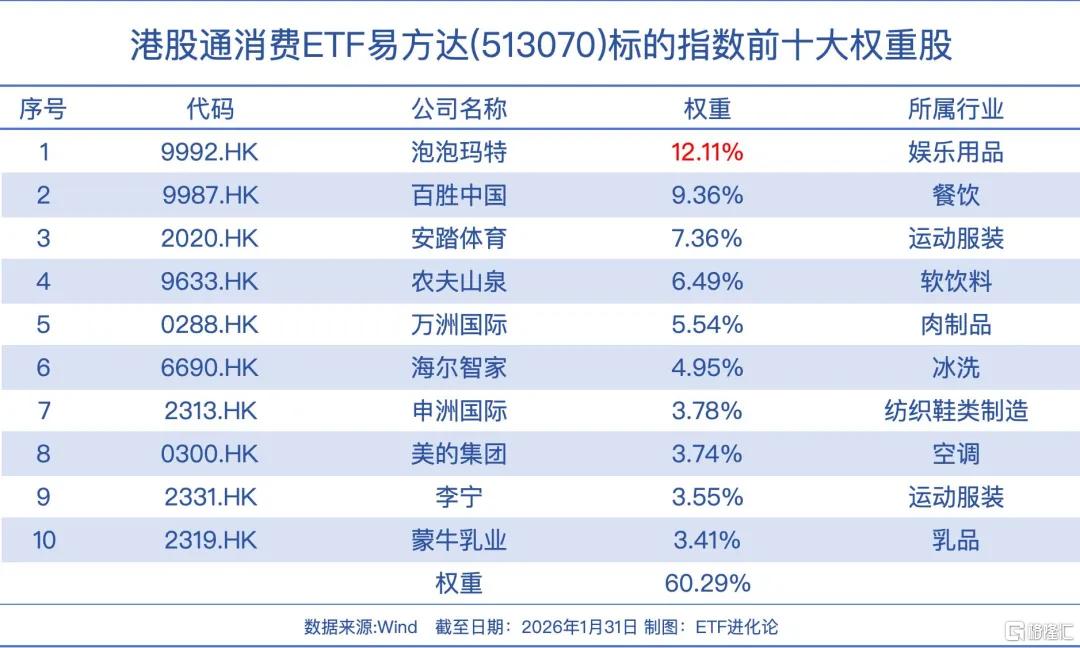 港股通消费ETF易方达(513070)及其联接基金(A类018103/C类018104)标的指数既覆盖酒旅、餐饮等传统服务消费龙头,也包含潮玩、金饰等成长型消费资产,同时纳入运动服饰、白电等高股息标的。目前指数整体PE约18.25倍,股息率约3.56%。其中,第一大权重股泡泡玛特占比超12%,为港股消费类ETF中最高。