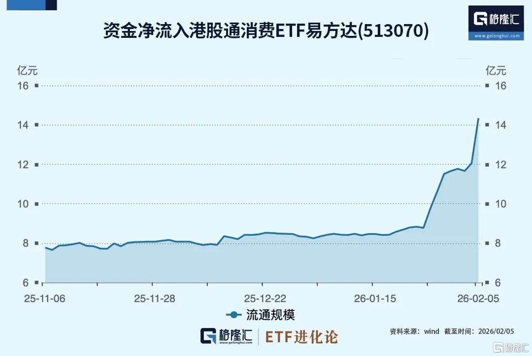 从资金面看,港股通消费ETF易方达(513070)近10日资金净流入5.04亿元,最新规模14.34亿元,在同类产品中居首。该ETF支持T+0交易,综合费率为0.2%,为全市场港股消费类ETF中的最低水平。