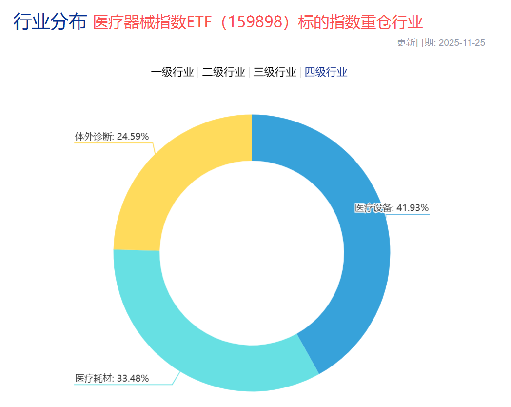 据了解,医疗器械指数ETF(159898)跟踪中证全指医疗器械指数,前十大覆盖迈瑞医疗、联影医疗、奕瑞科技、新产业等多个细分产业龙头,成份股主要分布在医疗设备、医疗耗材、体外诊断等板块,百分之百聚焦A股医疗器械,或能借道把握行业整体β机遇。
