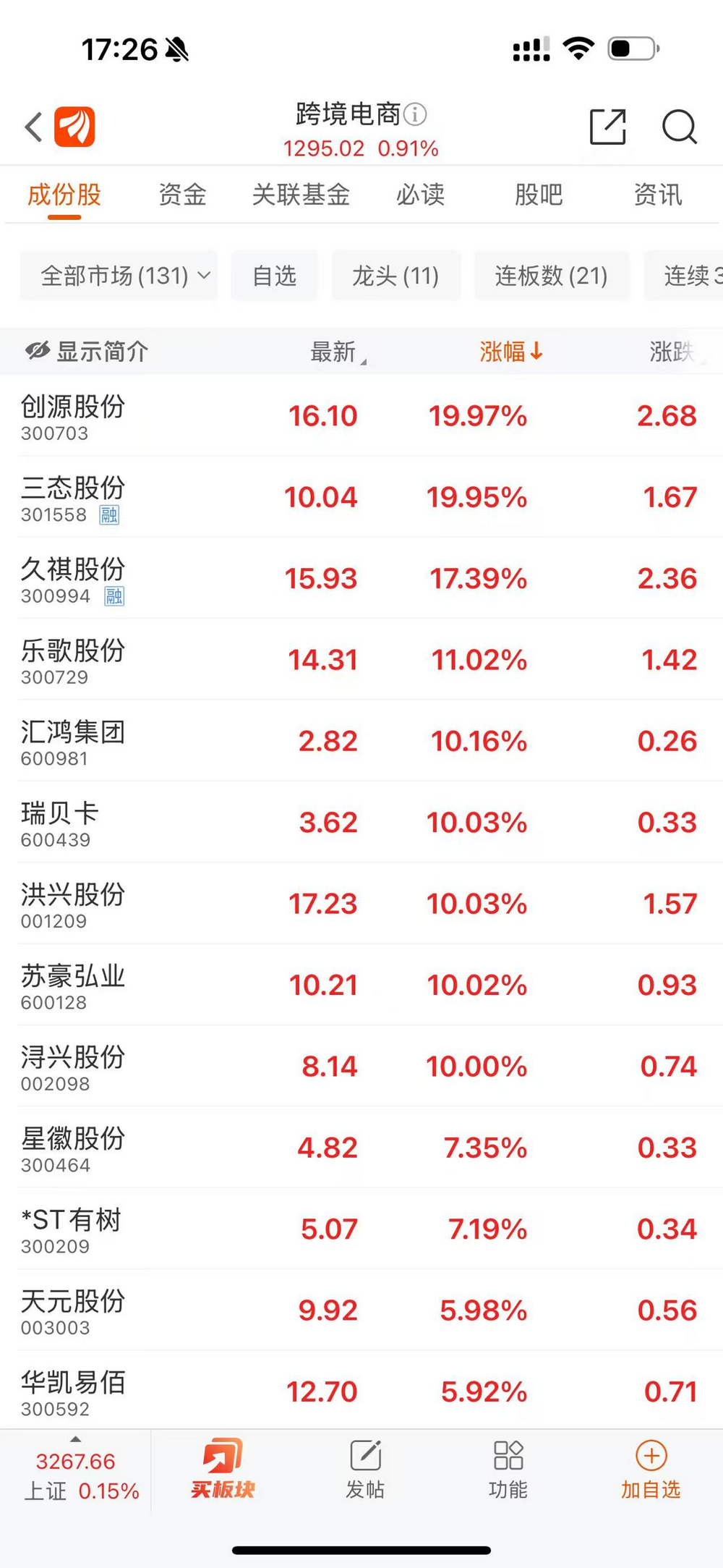 或受此影响,“敦煌网”概念股讨论火热,跨境电商板块掀起涨停潮。截至收盘,创源股份、三态股份收获20CM涨停,瑞贝卡、苏豪弘业等多股涨停。