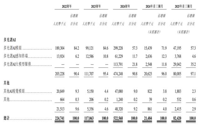 海清智元也意识到了未来市场的激烈竞争,将多光谱AI业务拆分成了多港普AI模组、多光谱AI感知终端和多光谱AI大模型服务三条线。尽管如此,海清智元依然高度依赖多光谱AI模组这一业务线。2022年到2024年,这一业务分别贡献了84.2%、84.6%和57.3%的营收。