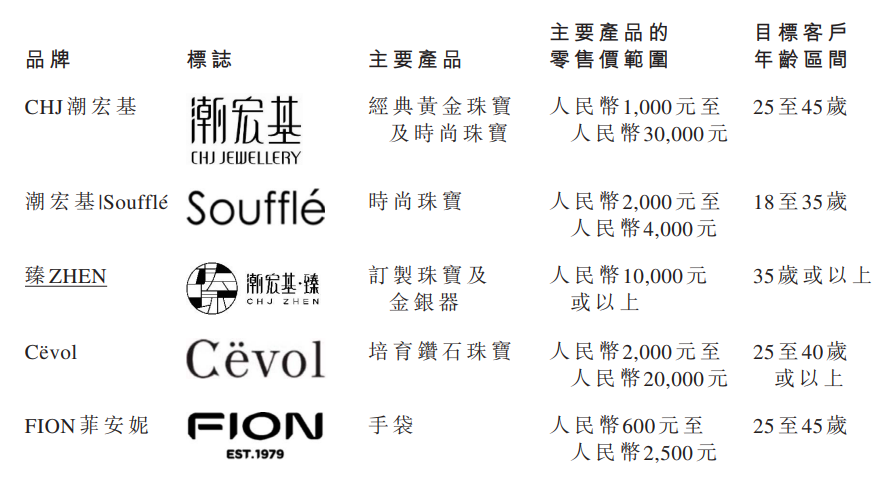 公司表示,旗下以CHJ潮宏基、潮宏基|Soufflé、臻ZHEN、Cevol等珠宝品牌提供珠宝首饰产品,以及以FION菲安妮品牌提供手袋。其中CHJ潮宏基主打经典黄金珠宝及时尚珠宝、潮宏基|Soufflé专营时尚珠宝、臻ZHEN提供订制珠宝及金银器、Cevol提供培育钻石珠宝。