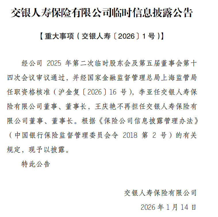 日前,交银人寿保险有限公司(下称“交银人寿”)公告称,经公司2025年第二次临时股东会及第五届董事会第十四次会议审议通过,并经金融监管总局上海监管局任职资格核准,李亚任交银人寿董事、董事长,王庆艳不再担任交银人寿董事、董事长。记者注意到,目前交银人寿官网已将高管名单同步更新。