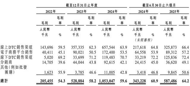 目前,伯希和的收入主要来自线上。报告期内,该公司的线上DTC销售渠道收入分别约为2.42亿元、5.74亿元、10.29亿元和4.91亿元,占总收入的比例分别约为63.8%、63.2%、58.2%、59.6%和53.6%,包括电子商务平台及内容平台上的直营线上旗舰店。