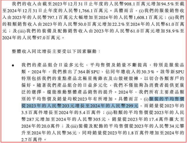 但贝多商业&贝多财经发现,伯希和在招股书P324页中披露【截至2024年12月31日止年度与截至2023年12月31日止年度相比】时,再次出现数据披露,称“服装的平均售价从2023年的人民币203元增长至2024年的人民币299元”。