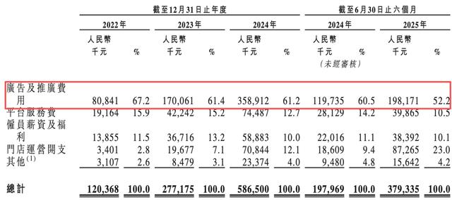 仅就2025年上半年而言,伯希和就产生了1.99亿元的广告费(即广告及推广费用),较2024年同期的1.20亿元增长65.5%,但占销售及分销开支的比例由2024年上半年的60.5%下降至2025年同期的52.2%。