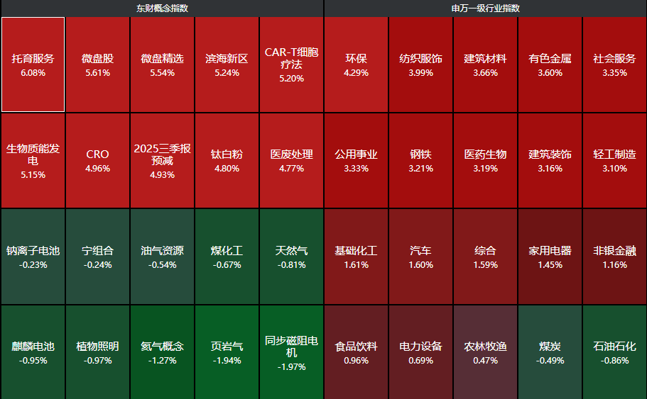 分行业来看,环保、纺织服饰、建筑材料、有色金属、社会服务等行业领涨,石油石化、煤炭两大行业下跌。