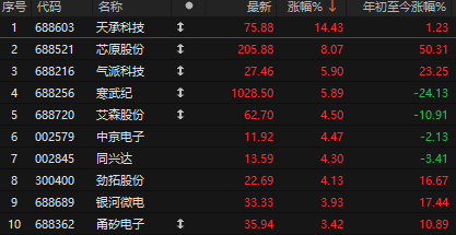 今天盘中国产芯片走强,沐曦股份涨超13%,芯原股份涨超8%,寒武纪涨近6%。