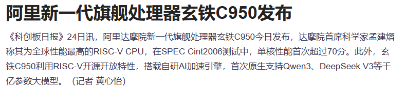 阿里达摩院新一代旗舰处理器玄铁C950今日发布,达摩院首席科学家孟建熠称其为全球性能最高的RISC-V CPU,在SPEC Cint2006测试中,单核性能首次超过70分。