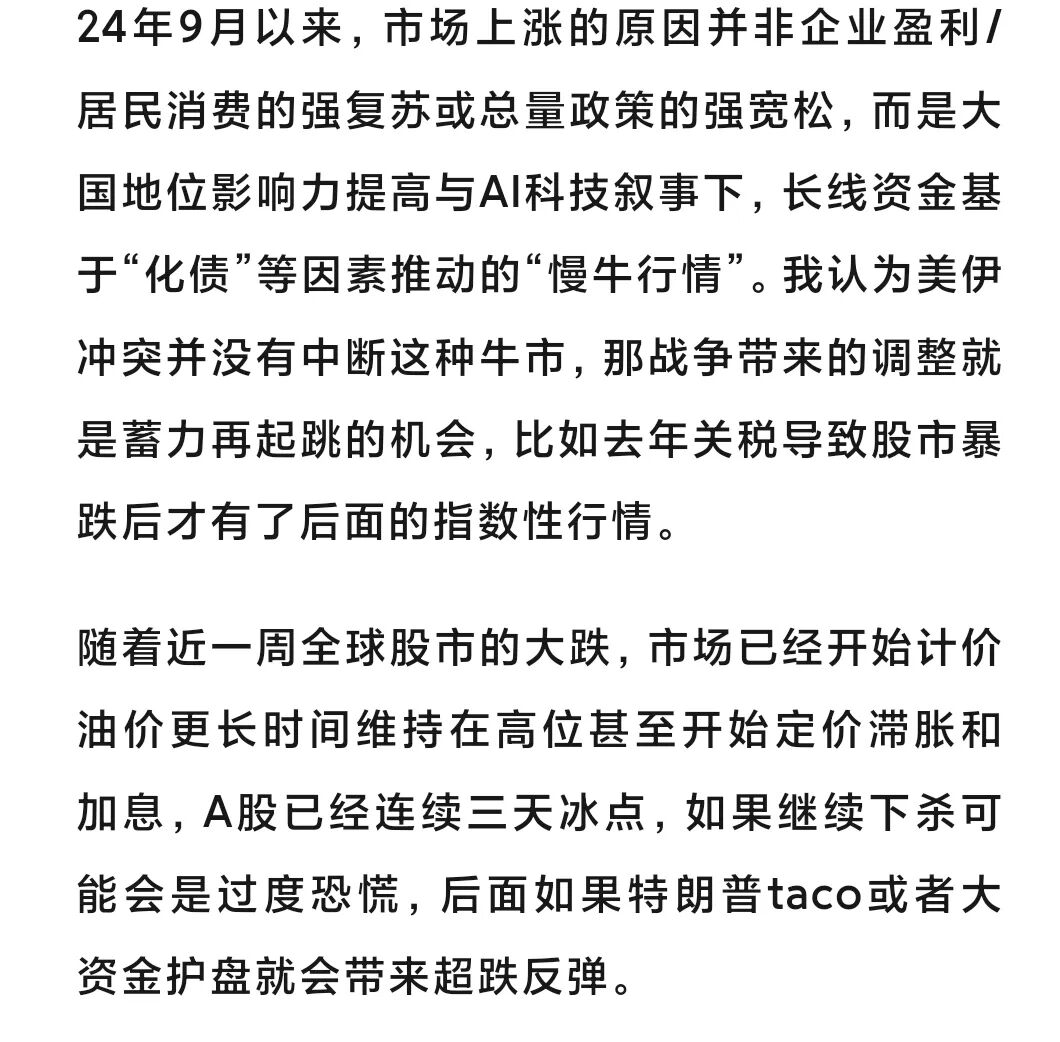 我们昨天也提到,美伊冲突并没有中断A股慢牛,战争带来的调整是蓄力再起跳。而A股在连续三天暴跌后,市场情绪已达到冰点,超跌反弹一触即发,虽然昨晚的“taco大戏”真真假假难以说清,但重要的是给了缓和的预期而不是继续升级,从而给股市带来了喘息期。