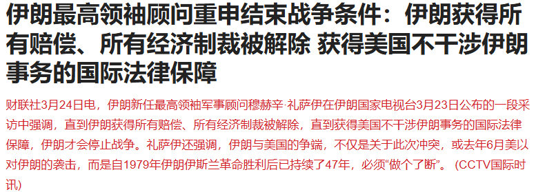 伊朗新任最高领袖军事顾问穆赫辛·礼萨伊在伊朗国家电视台3月23日公布的一段采访中强调,直到伊朗获得所有赔偿、所有经济制裁被解除,直到获得美国不干涉伊朗事务的国际法律保障,伊朗才会停止战争。