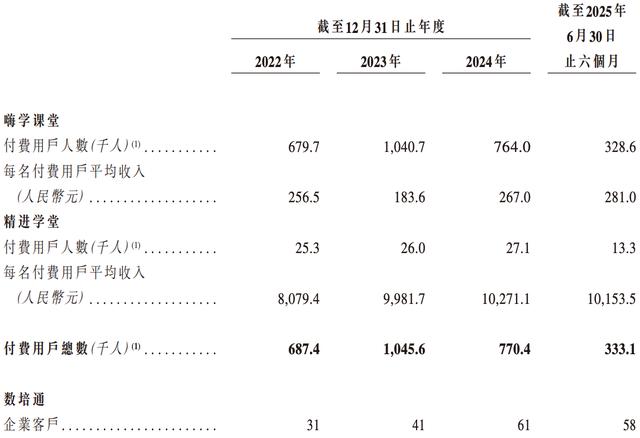 据招股书披露,截至2025年6月30日,嗨学的注册用户约为2230万(人),付费用户总数约为430万,用户付费率约为19.28%。报告期内,该公司付费用户分别约为68.74万、104.56万、77.04万和33.31万。