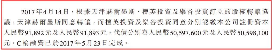 同在2017年2月,檀英投资、乐谷投资、海宁创领、昆景新源参与了嗨学的C轮融资,合计约2059万元。另在2027年4月,天津赫尔墨斯向檀英投资、乐谷投资转让了所持嗨学的部分股权,分别作价5059.76万元、5059.81万元。