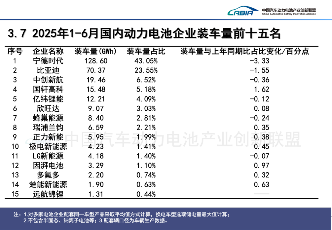 根据中国汽车动力电池产业创新联盟数据,2025年1-6月国内动力电池企业装车量排行榜中,宁德时代仍以128.6GWh的动力电池装车量位列第一,但增长速度已经跑输大盘,装车量占比为43.05%,同比下降了3.33个百分点,是前十五名中份额下降最多的企业。