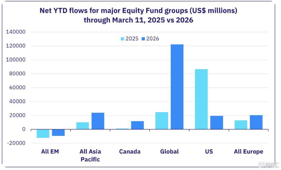 截至3月11日当周,EPFR跟踪的全球基金数据显示,股票基金净流入135亿美元,全球新兴市场债券和股票基金首次出现净赎回,瑞士和日本股票基金成为资金避险首选,韩国股票基金也创周度流入新高。