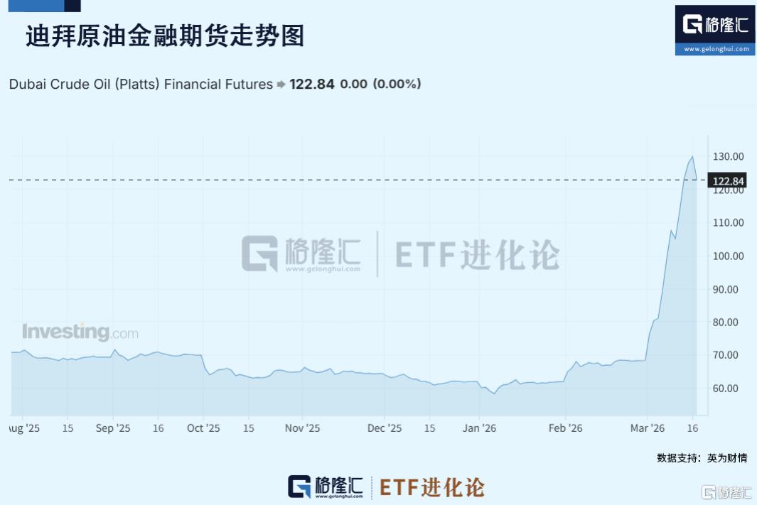 最新数据显示,衡量中东原油实物短缺的Dubai原油期货目前定价122美元(注:Dubai原油期货亚洲长期出口合约定价,是衡量亚洲能源市场受挤压程度更准确的指标。)